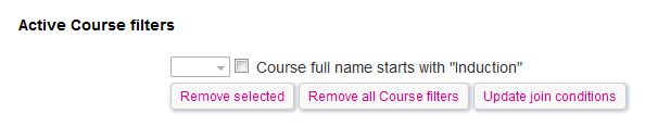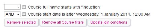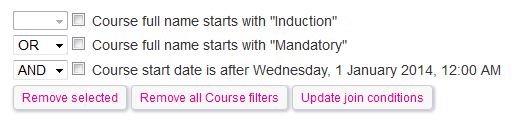 By default, multiple filters use AND logic. For example, in the example below the report will only show induction courses that started after 2013