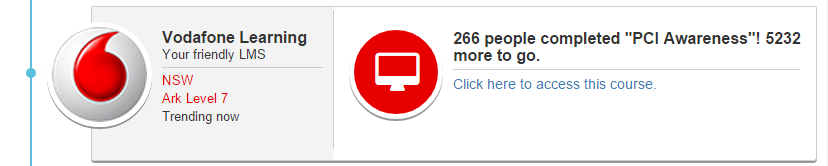 If you want to promote completion of a new course or drive up-take of a badge award for compliance then you can configure particular courses or badges to be tracked in the block configuration. Those selected will rotate their appearance at the top of the timeline with a summary of current progress (e.g. 675/1000 have completed) and an indication of whether the logged in user has completed or still needs to complete.